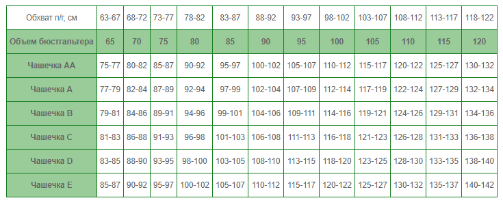 Измерьте окружность тела непосредственно под линией бюста и, используя таблицу, определите соответствующий размер бюстгальтера.