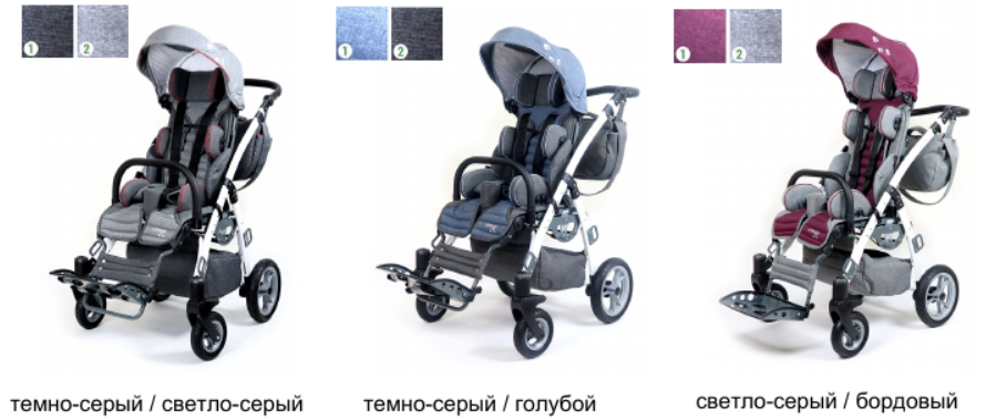 Специальная коляска GRIZZLY доступна в трёх цветовых вариантах: сером, синем и бордовом.