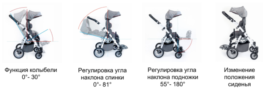 Регулировка угла наклона спинки Регулировка угла наклона сиденья Блокировка передних колес Функция перестановки сиденья по направлению Регулировка спинки по высоте Регулировка глубины сиденья Регулировка ширины сиденья Съёмное сиденье |