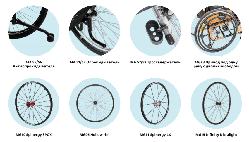 - Возможность заменить спицы приводного колеса (Spinergy SPOX, Spinergy LX, Spinergy LXL Blade, Infinity Ultralight)
