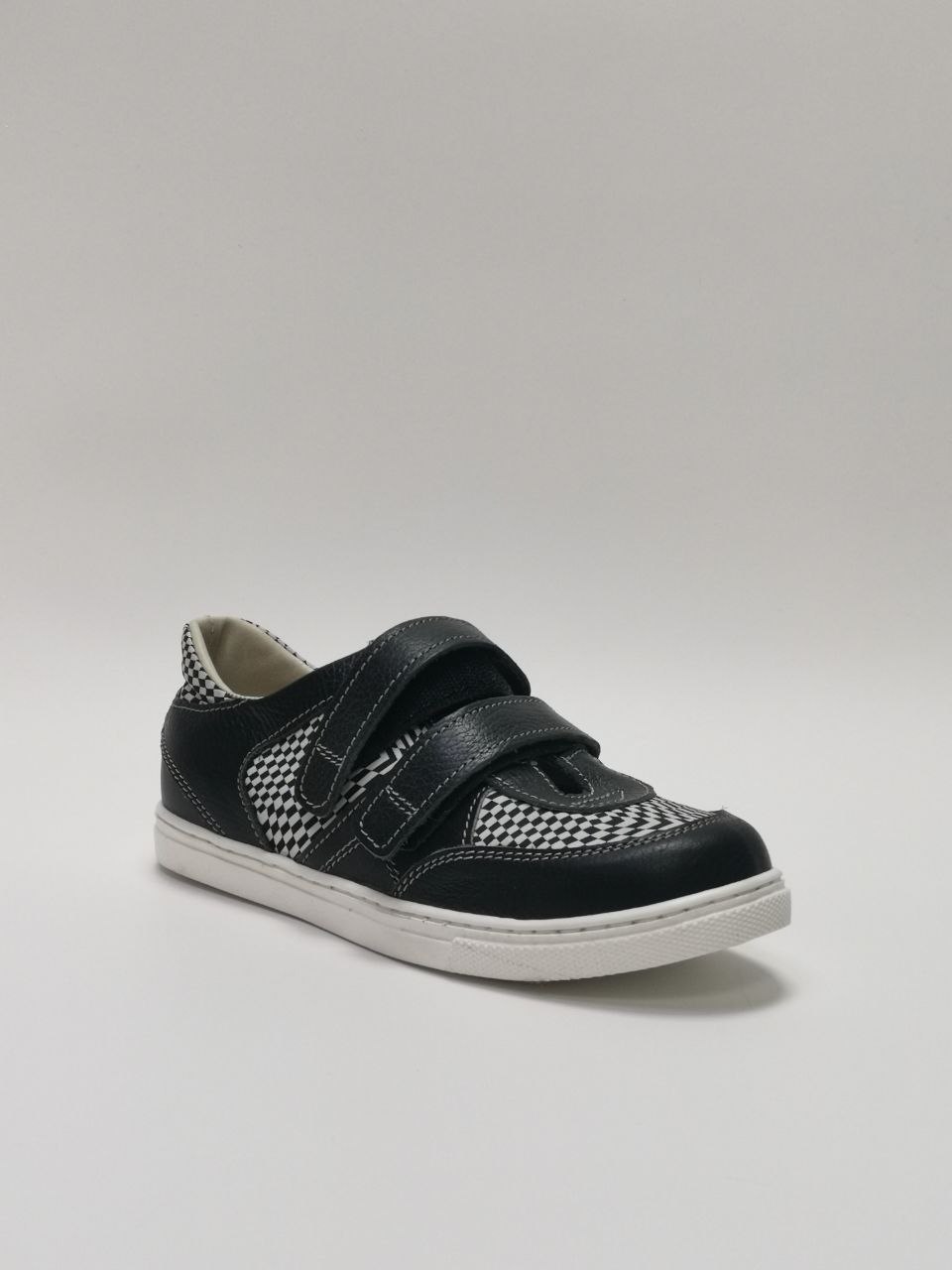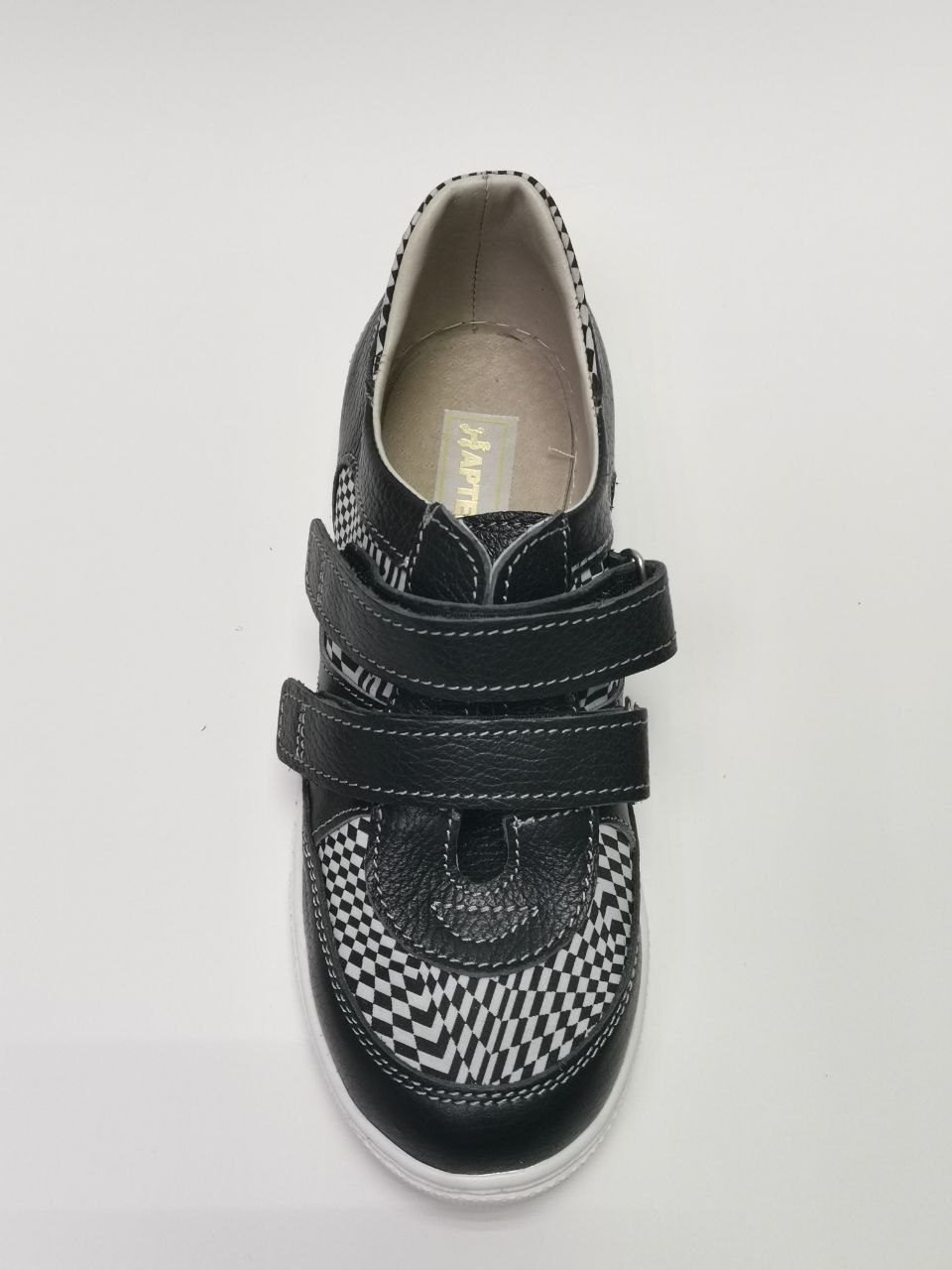 Полуботинки кроссовочного типа на 2-х ремнях и застежкой «велькро» с жестким внутренним задником, продленным до пучков. Верх – кожа. Кожподкладка.